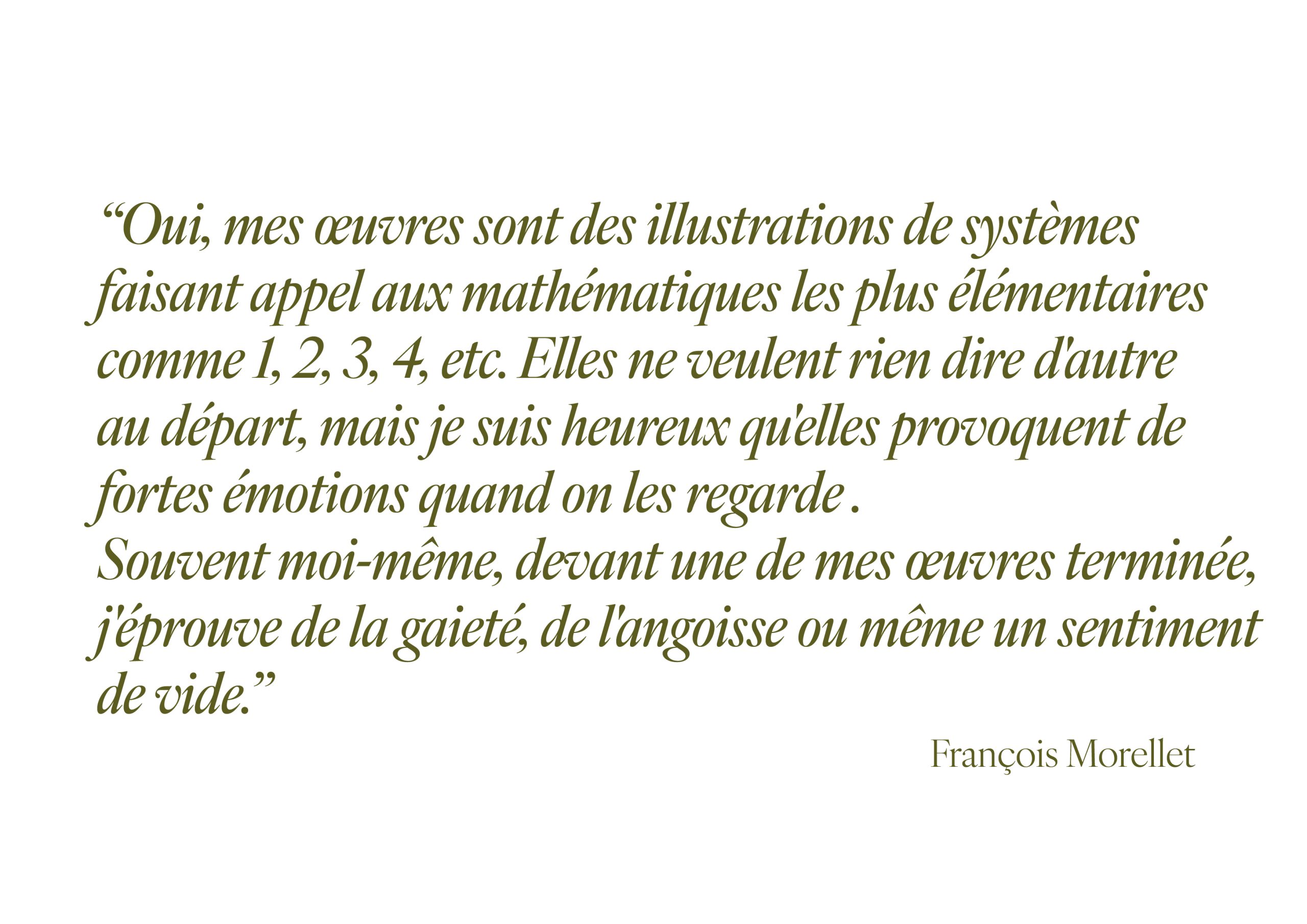 Après des études de russe à l’École des Langues Orientales, François Morellet (1926-2016) rejoint l’entreprise familiale spécialisée dans les jouets pour enfants. Parallèlement, en 1948, il se forme de manière autodidacte à la peinture et entame sa carrière artistique. En 1950, il présente sa première exposition personnelle à la Galerie Creuze à Paris. François Morellet est reconnu pour sa maîtrise des formes géométriques simples, qu’il assemble, superpose, fragmente ou dispose de manière aléatoire.