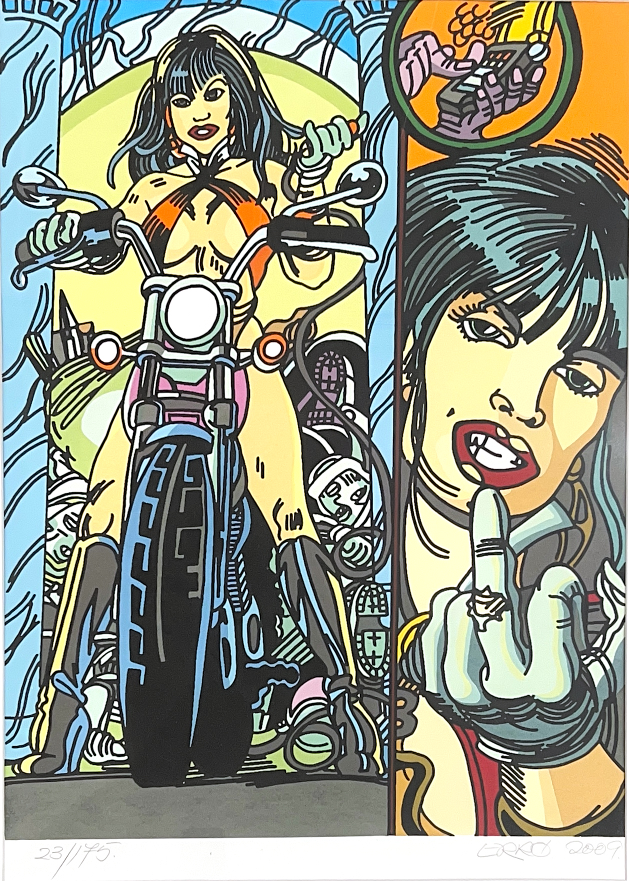 Guðmundur Erró (né en 1932), peintre et graveur islandais, est le cofondateur du mouvement pictural de la figuration narrative en France. S’installant à Paris en 1958, il rencontre des figures majeures du surréalisme telles qu’André Breton, Roberto Matta, Max Ernst, Man Ray, Joan Miró et Marcel Duchamp. Depuis les années 1970, il réalise de nombreuses estampes, notamment des lithographies et des sérigraphies, et se lance dans l’aquagravure en 2013. En 2020, il présente une exposition individuelle à la galerie Perrotin de New York.