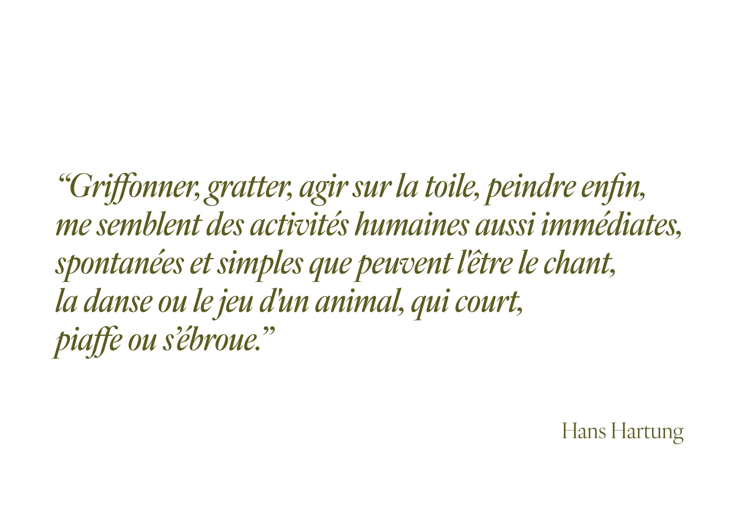 Pionnier de l’art abstrait après la Seconde Guerre mondiale, Hartung intègre l’idée du hasard et de l’intuition dans son processus créatif. Utilisant divers outils — brosses, râteaux, pulvérisateurs —, il donne naissance à des œuvres qui allient rigueur et liberté, avec des contrastes forts entre lignes et aplats de couleur.