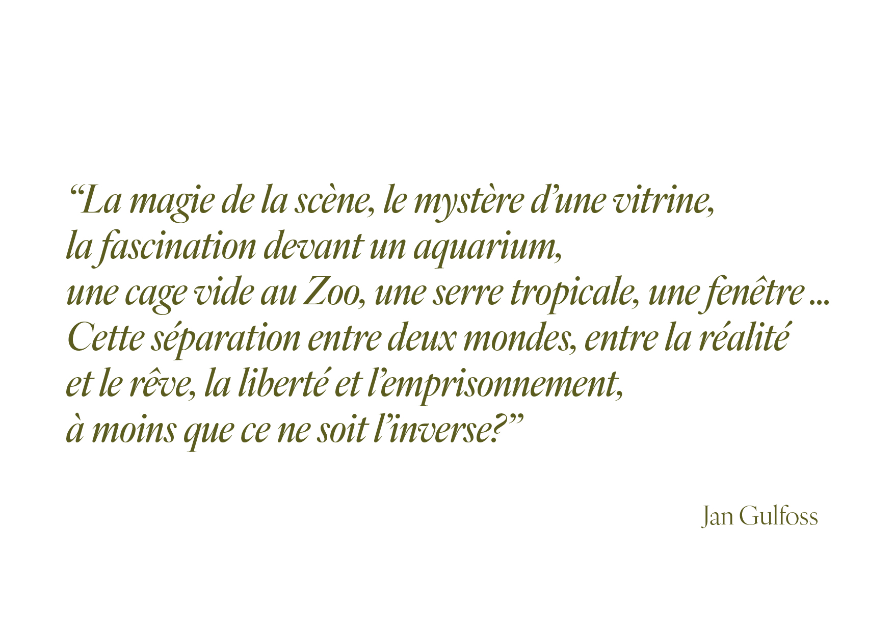 Jan Gulfoss (1957-2025) est un artiste passionné par la nature et les animaux, qu’il célèbre à travers un travail mêlant dessin, peinture, photographie et vidéo. Il commence à créer très jeune avant de se former à la Villa Arson à Nice. Depuis, il met son art au service de la préservation du vivant.