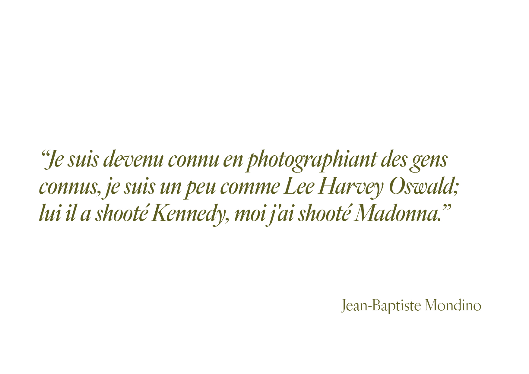 Peu enclin à dévoiler sa vie privée, Jean-Baptiste Mondino cultive une part de mystère qui entoure autant l’homme que son œuvre. Photographe et réalisateur de clips parmi les plus emblématiques de sa génération, il s’est distingué par de nombreuses récompenses et des collaborations prestigieuses avec des figures majeures de la musique telles que Madonna, Vanessa Paradis ou David Bowie.