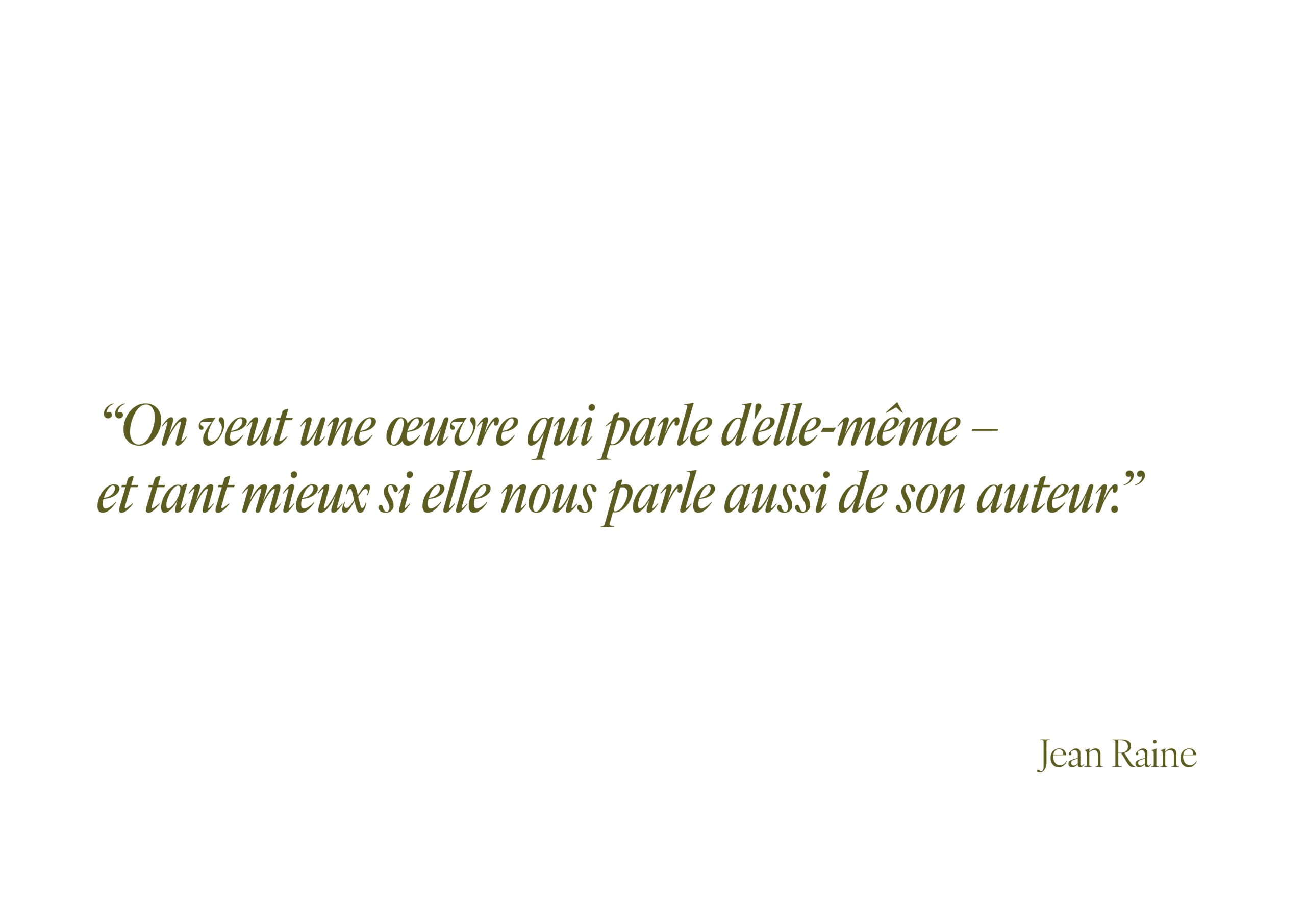Né Jean-Philippe Robert Geenen, Jean Raine (1927-1986) est un peintre, écrivain et cinéaste belge. Dans les années 1945, il fait la rencontre de Pierre Alechinsky et s’engage en tant que poète et cinéaste dans l’aventure du groupe d’artistes CoBrA. Très influencé par le surréalisme, il rencontre à Bruxelles René Magritte et Marcel Lecomte. Plus tard, à son arrivée à Paris, il rend visite à André Breton, qui le présente au docteur Pierre Mabille. Avec ce dernier, il réalise son premier film documentaire, Le test du Village. Tout au long de sa vie, les poèmes et les textes accompagnent Jean Raine, mais peu à peu, les mots deviennent insuffisants pour exprimer ses idées, et il commence alors vers le dessin, puis la peinture.