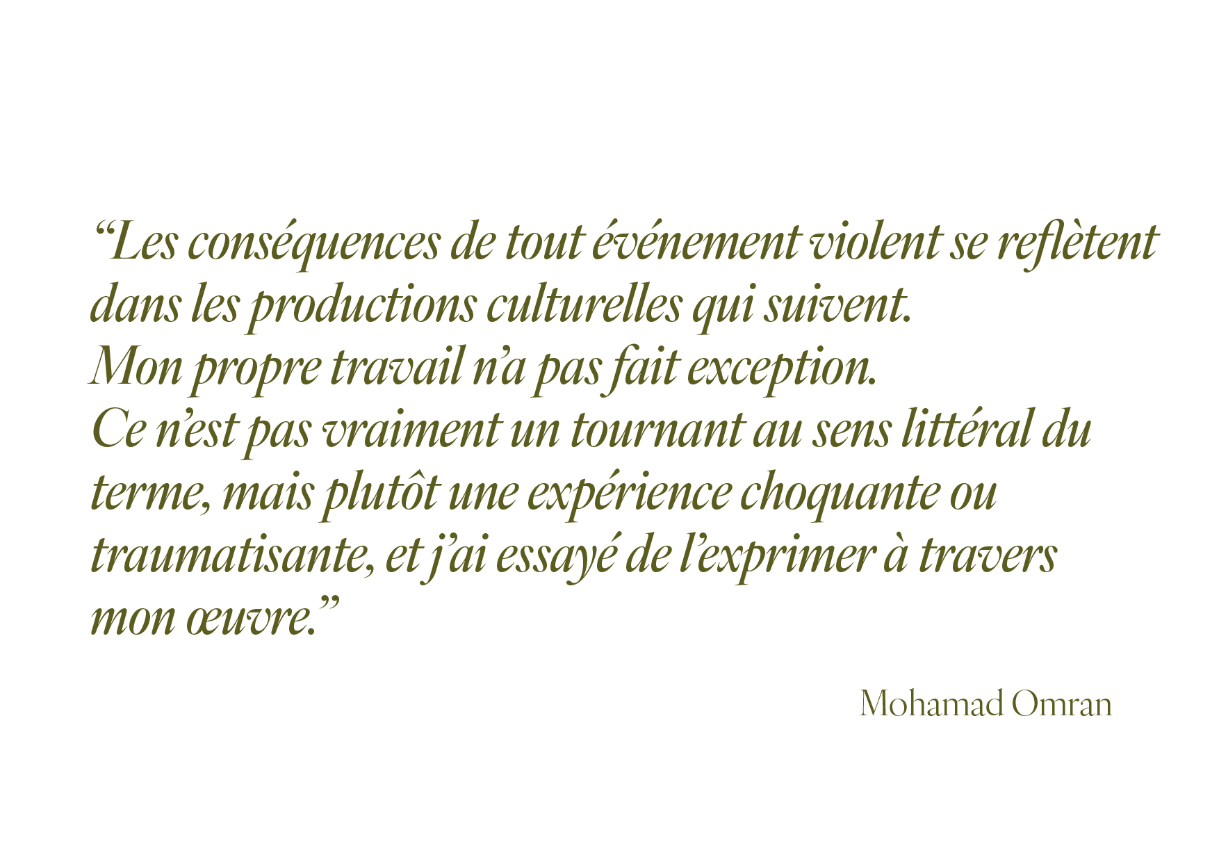 Originaire de Damas, Mohamad Omran (né en 1979), commence une carrière de sculpteur qui est directement acclamée sur la scène artistique locale. Il quitte la Syrie en 2007 afin d’entreprendre un master en histoire de l’art à l’Université de Lyon II. Peu de temps après, ses œuvres papiers ainsi que ses sculptures seront vite remarquées, il multipliera les expositions collectives comme individuelles. Le corps humain constitue le centre essentiel de son travail pratique ainsi que théorique.