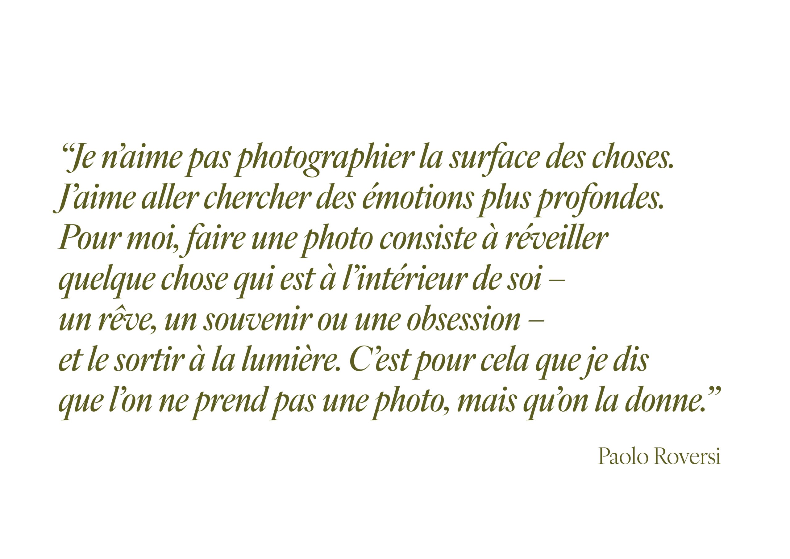Photographe autodidacte italien, Paolo Roversi (né en 1947) commence à se perfectionner dès son adolescence auprès d’un photographe local. Sur les conseils de Peter Knapp, alors directeur artistique du magazine Elle, il s’installe à Paris. Il collabore avec l’agence Huppert avant de devenir l’assistant de Lawrence Sackman. En 1975, il fait le choix de se lancer comme photographe indépendant, ce qui lui permet de travailler pour des publications prestigieuses telles que Vogue Italia, Depeche Mode, Marie Claire et British Vogue. Il immortalise les campagnes de la Haute Couture pour des maisons emblématiques comme Lanvin et Dior, tout en photographiant certains des plus grands mannequins du XXe siècle, dont Isabella Rossellini, Kate Moss et Laetitia Casta.