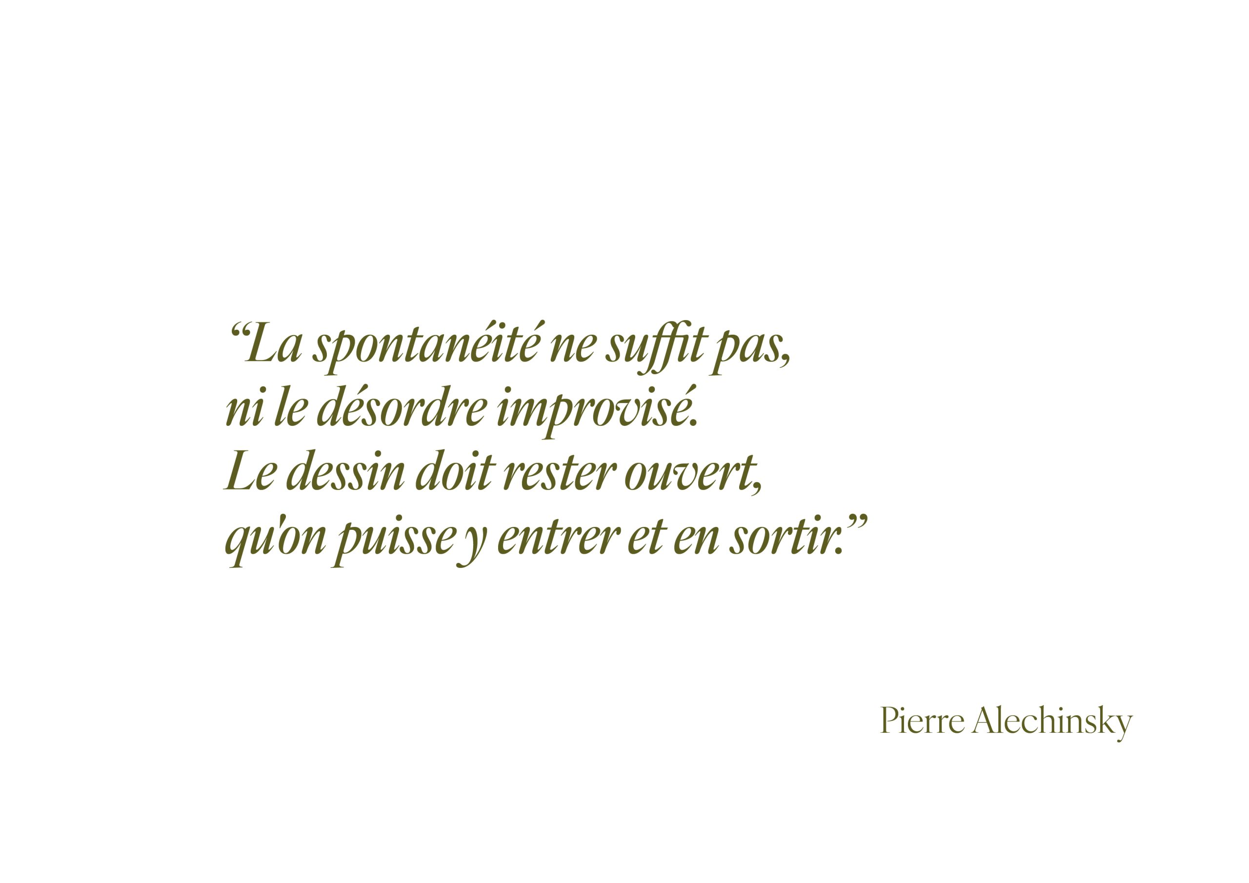 Membre fondateur du groupe CoBrA aux côtés de Karel Appel et Jean Raine, Pierre Alechinsky (né en 1927) est un peintre, dessinateur et graveur belge. Après avoir étudié la typographie et l’illustration entre 1944 et 1948, il se lance dans la peinture en autodidacte avant de rejoindre en 1947 le groupe Jeune Peintre Belge. Sa rencontre avec le poète Christian Dotremont le conduit, en 1949, à intégrer le groupe CoBrA (Copenhague/Bruxelles/Amsterdam). En 1965, André Breton choisit son œuvre Central Park (1965) pour l’exposition L’écart l’absolu, XIe Exposition internationale du Surréalisme à la Galerie de l’Œil. Sur commande, il réalise plusieurs œuvres monumentales, telles que le Salon d’accueil du Ministère de la Culture (1985) et la rotonde reliant l’Hôtel de Lassay à l’Assemblée nationale (1993). Son œuvre, qui allie expressionnisme et surréalisme, se distingue par une approche spontanée et expressive.