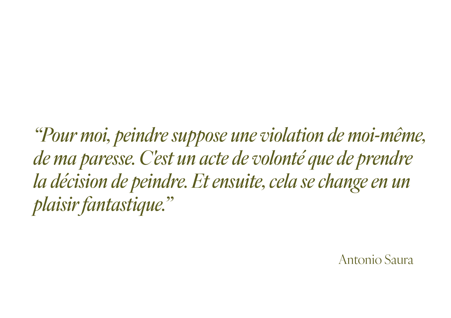 Peintre et écrivain espagnol majeur du XXᵉ siècle, Antonio Saura (1930–1998) né à Huesca. Il développe très tôt une passion pour la peinture pendant une longue convalescence due à la tuberculose. Autodidacte, il commence par un style onirique influencé par le surréalisme, mais évolue rapidement vers une peinture plus gestuelle et expressive, en particulier après ses séjours à Paris dans les années 1950.