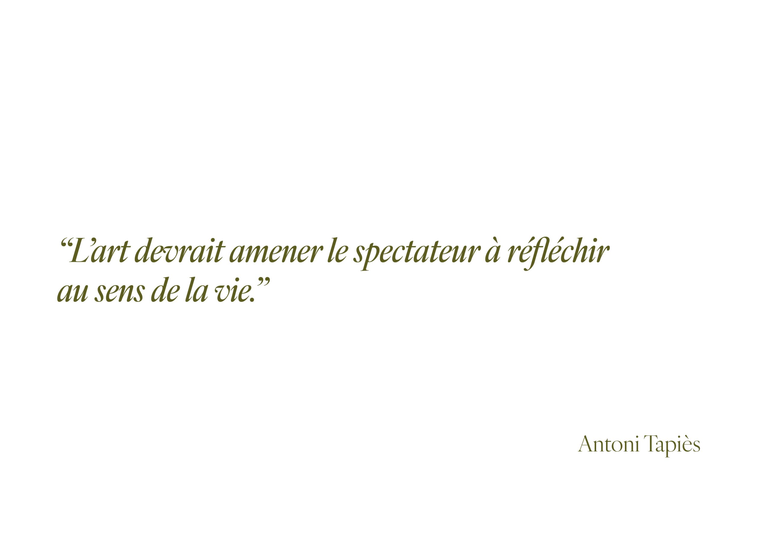 Il est l’un des artistes espagnols les plus influents du XXᵉ siècle, Antoni Tàpies (1923–2012) né à Barcelone, est une figure majeure de l’art informel et de l’abstraction contemporaine. Son œuvre se caractérise par l’utilisation de matériaux bruts tels que le sable, la terre, les tissus et les objets du quotidien ainsi que par une réflexion profonde sur la matière, le signe et la spiritualité. À travers peintures, sculptures et gravures, Tàpies a exploré les liens entre l’art, la mémoire et la condition humaine. Son travail est aujourd’hui exposé dans les plus grands musées internationaux.