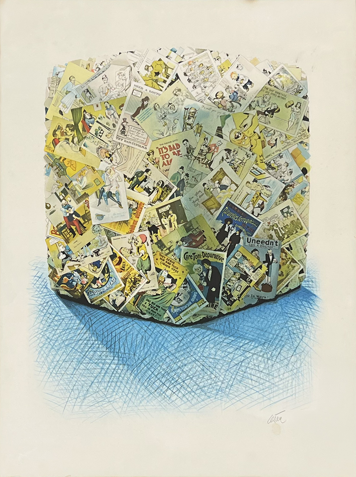 Compression De Cartes Postales, 1979. Lithographie. Signée à la mine de plomb, empreinte de doigt. Tirage à 150 exemplaires. Éditeur : Mourlot, Paris. A vue : 91 x 70 cm. Encadrée : 102 x 81,5 cm.