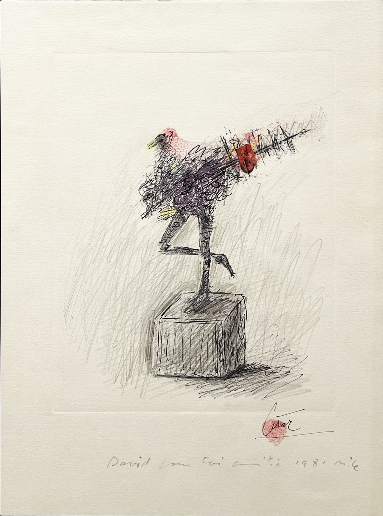 Signée au crayon et de son empreinte à l’encre rouge, dedicacée “David pour toi amitié”, 1981”.